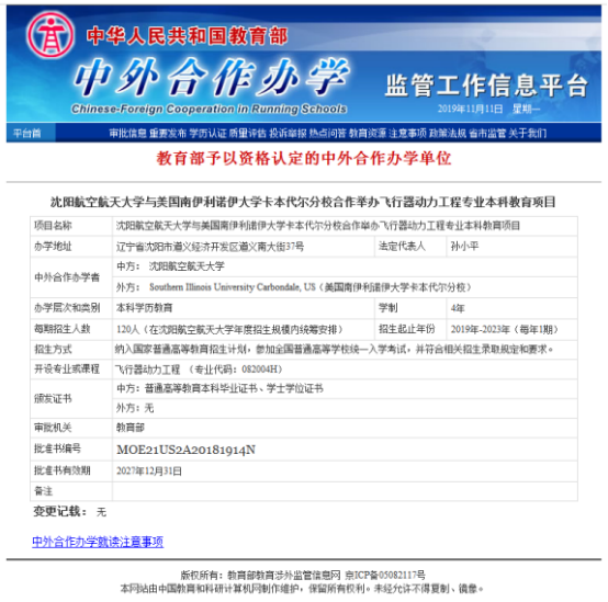 飞行器动力工程专业中美合作办学项目为77779193永利官网集团与美国南伊利诺伊大学卡本代尔分校合作举办的本科教育项目,于2018年经国家教育部批准(批准书编号:MOE21US2A20181914N)。双方整合优质的教育教学资源,共同商定教学计划,旨在培养适应现代科学技术与经济社会发展需要,拥有先进技术和管理理念,国际沟通能力较强的应用型、创新型、国际化专业人才。