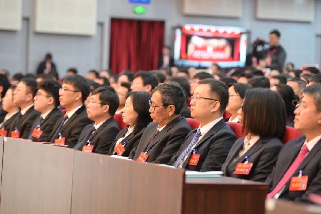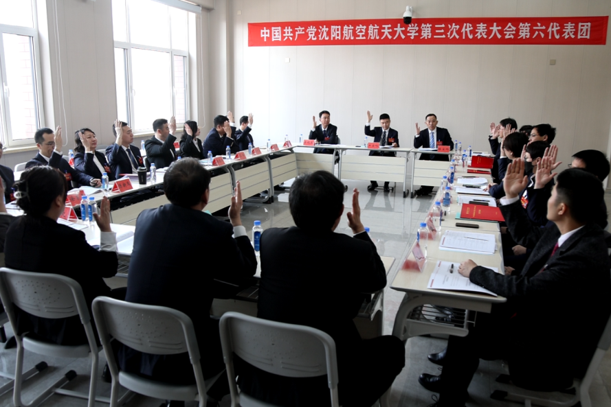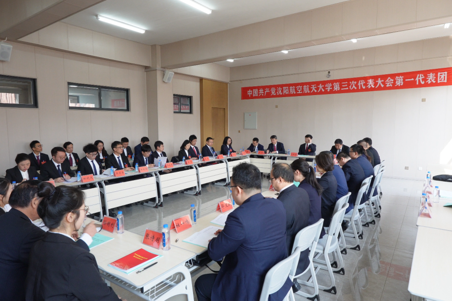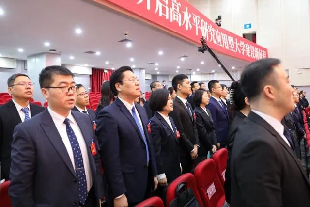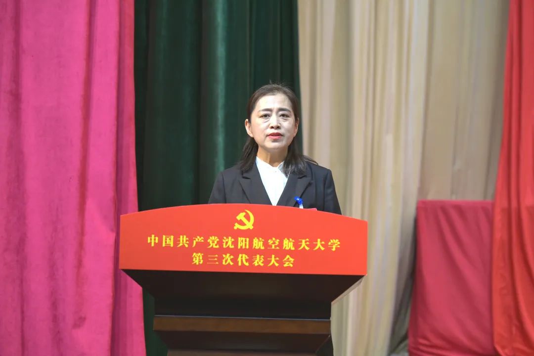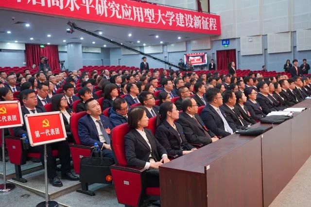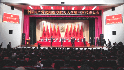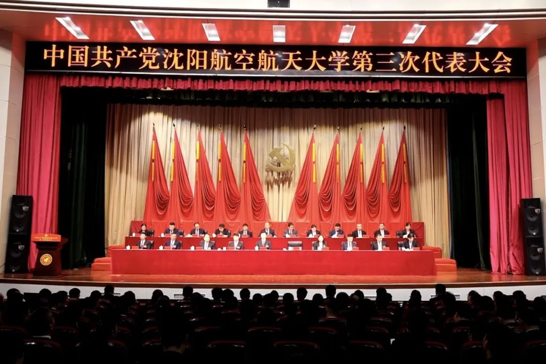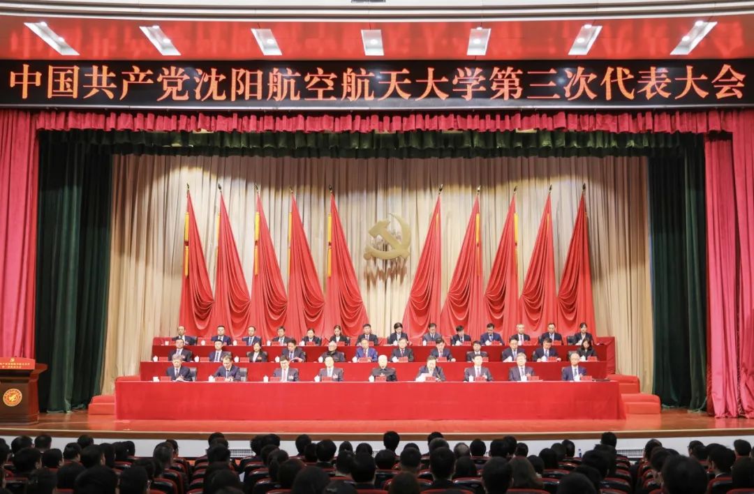 大会会场气氛庄严热烈,主席台正中悬挂的中国共产党党徽熠熠生辉,10面红旗鲜艳胜火,分列两侧。“矢志空天报国,聚力振兴发展,奋力开启高水平研究应用型大学建设新征程”的标语庄重醒目。
