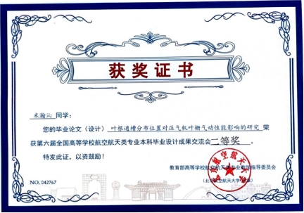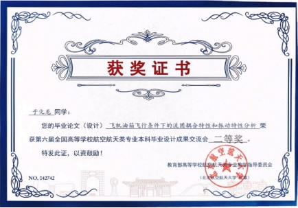 于化龙同学的《叶根通槽分布位置对压气机气动性能影响的研究》(指导教师:张凤玲)荣获二等奖。毕设论文基于ANSYS软件对飞机油箱进行有限元仿真分析;模拟油箱的标准工作状态并对油箱不同工况进行关键数据对比,分析其振动特性;进而对油箱整体结构进行优化以提高油箱承载能力。