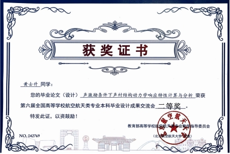 黄士升同学的《声激励条件下声衬结构动力学响应特性计算与分析》(指导教师:赵奉同)荣获二等奖。毕设论文围绕航空发动机声疲劳问题对声衬结构进行热模态及声激励响应计算,系统研究了其动力学响应特性的影响因素与变化规律,分析后优化材料选择和结构设计,对声衬结构进行改型从而确保其可靠性和降噪性能。
